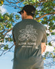 Design printed on the front and back of our custom cut and sew garment tee. Featuring a new set on collar on a super soft cotton fabric and includes our embroidered flag icon on bottom right side for style.