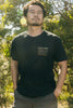 Design printed on the front and back of our custom cut and sew garment tee. Featuring a new set on collar on a super soft cotton fabric and includes our embroidered flag icon on bottom right side for style.